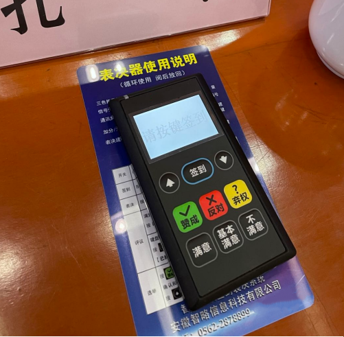 2、電子表決:會議電子表決系統(tǒng)的表決器,具有“贊成”、“反對”、“棄權(quán)”等按鍵鮮明,操作簡易,待機持久,會前反復(fù)測試,會中現(xiàn)場支持。特別適合于市、縣(區(qū))人民代表大會涉及表決事項時使用,數(shù)據(jù)準確,能和大會主持詞、顯示屏同步協(xié)調(diào)使用,頗受“人代會”的歡迎和好評。